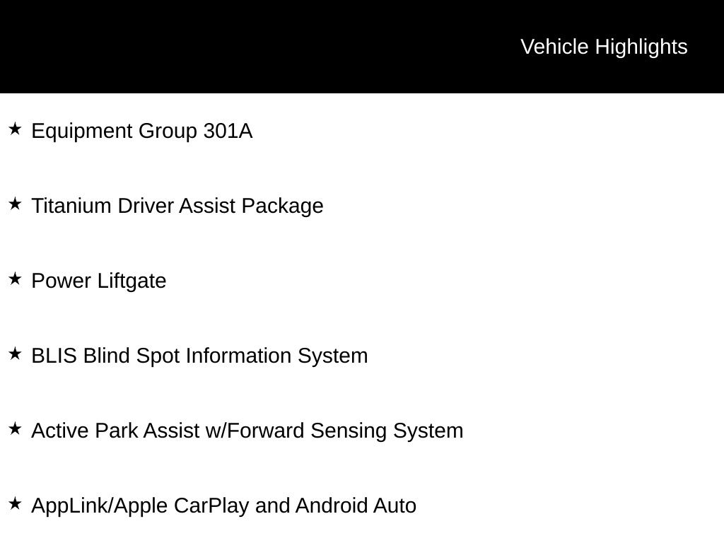 I4 Hybrid, Active Park Assist w/Forward Sensing System, AppLink/Apple CarPlay and Android Auto, BLIS Blind Spot Information System, Equipment Group 301A, Power Liftgate, Titanium Driver Assist Package.