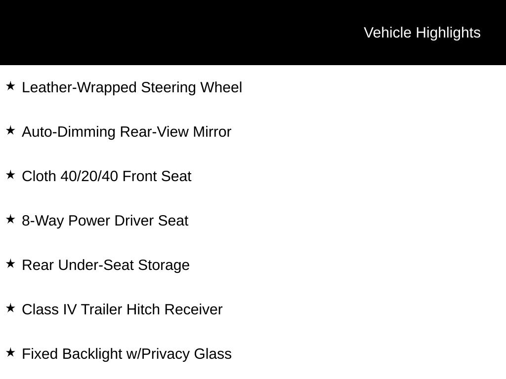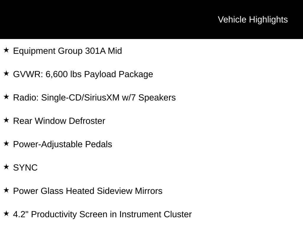 4WD, 4.2" Productivity Screen in Instrument Cluster, 8-Way Power Driver Seat, Auto-Dimming Rear-View Mirror, Class IV Trailer Hitch Receiver, Cloth 40/20/40 Front Seat, Equipment Group 301A Mid, Fixed Backlight w/Privacy Glass, GVWR: 6,600 lbs Payload Package, Leather-Wrapped Steering Wheel, Power Glass Heated Sideview Mirrors, Power-Adjustable Pedals, Radio: Single-CD/SiriusXM w/7 Speakers, Rear Under-Seat Storage, Rear Window Defroster, SYNC.