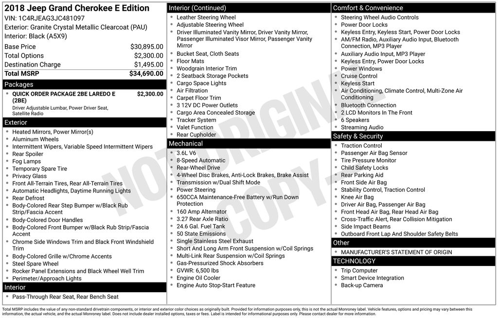 ** HERE AT BELL FORD ITS ALL ABOUT THE EXPERIENCE** Please visit us online at www.bellford.com This Jeep Grand Cherokee is equipped with the following options: Quick Order Package 2BE Laredo E (Bright Side Roof Rails, Power 4-Way Driver Lumbar Adjust, Power 8-Way Driver/Manual Passenger Seat, and SiriusXM Satellite Radio), 3.27 Rear Axle Ratio, 4-Wheel Disc Brakes, 6 Speakers, ABS brakes, Air Conditioning, Alloy wheels, AM/FM radio, Anti-whiplash front head restraints, Apple CarPlay/Android Auto, Automatic temperature control, Brake assist, Bumpers: body-color, Cloth Bucket Seats, Compass, Delay-off headlights, Driver door bin, Driver vanity mirror, Dual front impact airbags, Dual front side impact airbags, Eco Suspension I, Electronic Stability Control, Four wheel independent suspension, Front anti-roll bar, Front Bucket Seats, Front Center Armrest w/Storage, Front dual zone A/C, Front fog lights, Front reading lights, Fully automatic headlights, Heated door mirrors, Illuminated entry, Knee airbag, Leather Shift Knob, Low tire pressure warning, Manufacturer's Statement of Origin, Occupant sensing airbag, Outside temperature display, Overhead airbag, Overhead console, Panic alarm, ParkView Rear Back-Up Camera, Passenger door bin, Passenger vanity mirror, Power door mirrors, Power steering, Power windows, Radio data system, Radio: Uconnect 4 w/7" Display, Rear anti-roll bar, Rear Parking Sensors, Rear reading lights, Rear seat center armrest, Rear window defroster, Rear window wiper, Remote keyless entry, Speed control, Speed-Sensitive Wipers, Split folding rear seat, Spoiler, Steering Wheel Mounted Audio Controls, Steering wheel mounted audio controls, Tachometer, Telescoping steering wheel, Tilt steering wheel, Traction control, Trip computer, Variably intermittent wipers, and Wheels: 17" x 8.0" Silver AluminuM.