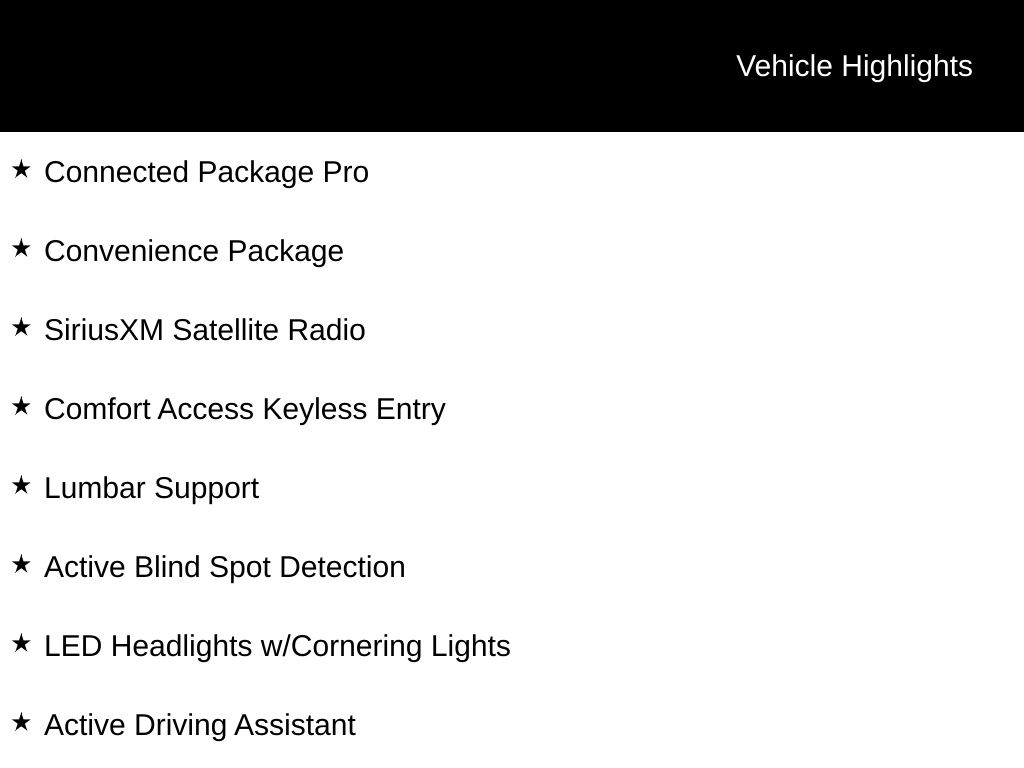 Convenience Package: Comfort Access Keyless Entry, Lumbar Support, SiriusXM Satellite Radio, Active Driving Assistant, and more