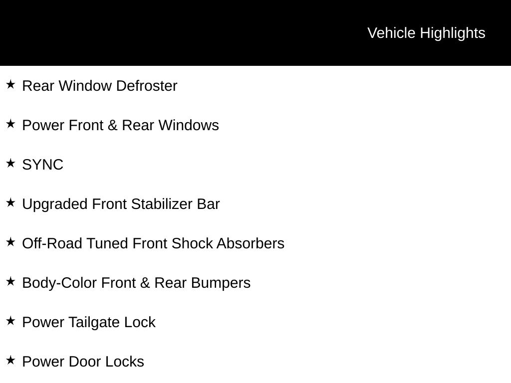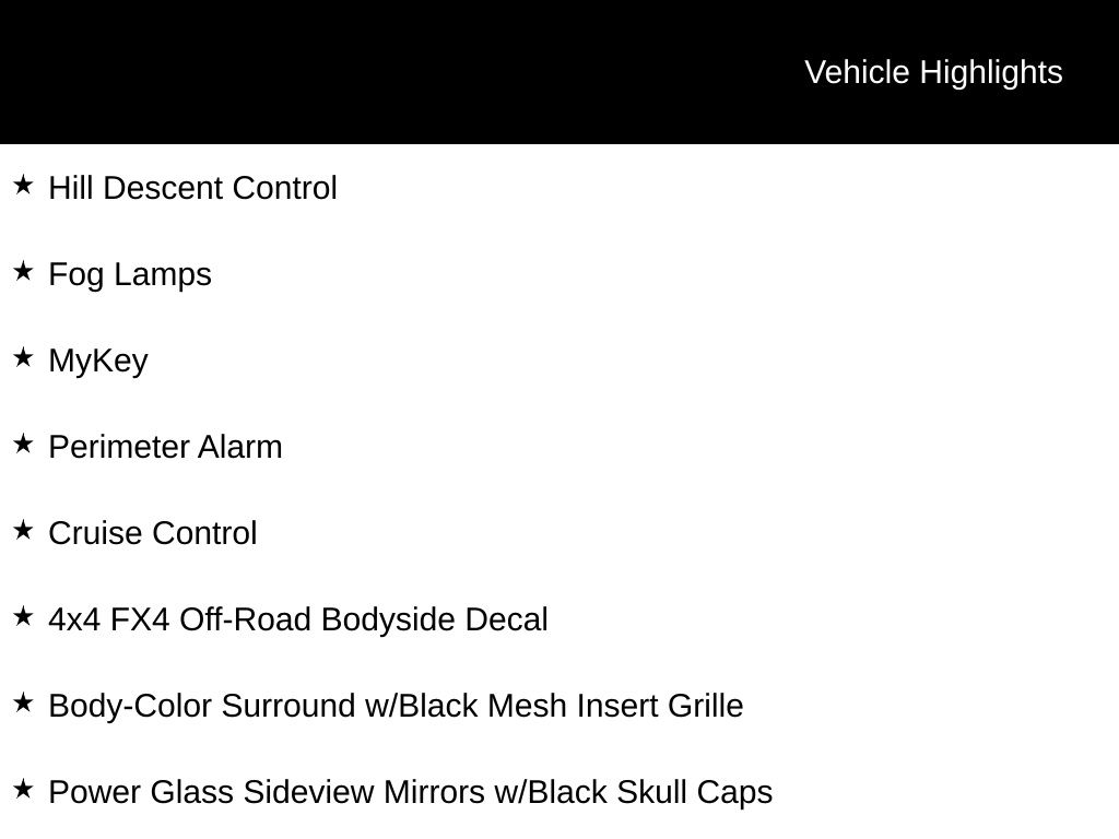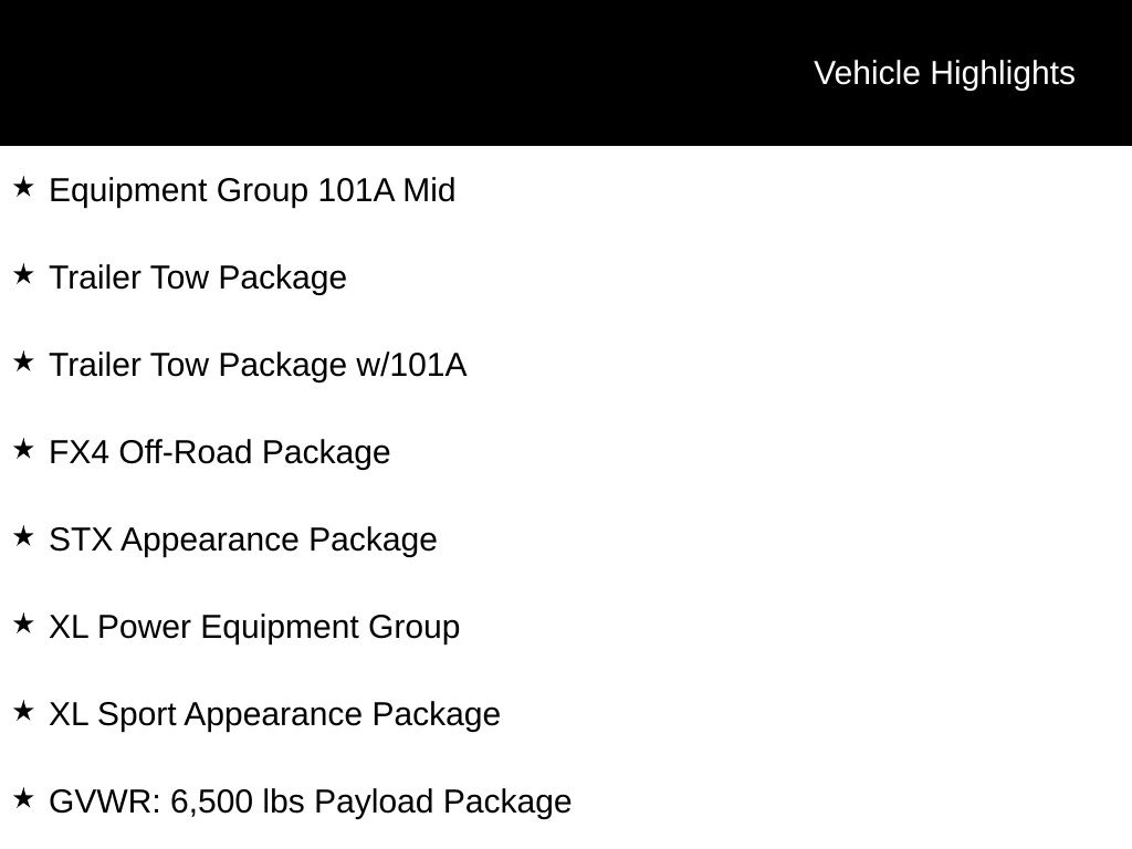 4WD, 20" Machined-Aluminum Wheels, 4.2" Productivity Screen in Instrument Cluster, 4x4 FX4 Off-Road Bodyside Decal, Body-Color Front & Rear Bumpers, Body-Color Surround w/Black Mesh Insert Grille, Box Side Decals, Class IV Trailer Hitch Receiver, Cruise Control, Driver/Passenger Seat Back Pocket, Equipment Group 101A Mid, Fog Lamps, FX4 Off-Road Package, GVWR: 6,500 lbs Payload Package, Hill Descent Control, Illuminated Entry, Manual Driver/Passenger Lumbar, MyKey, Off-Road Tuned Front Shock Absorbers, Perimeter Alarm, Power Door Locks, Power Front & Rear Windows, Power Glass Sideview Mirrors w/Black Skull Caps, Power Tailgate Lock, Pro Trailer Backup Assist, Rear Window Defroster, Rear Window Fixed Privacy Glass, STX Appearance Package, SYNC, SYNC 3, Trailer Tow Package, Trailer Tow Package w/101A, Unique Sport Cloth 40/20/40 Front-Seats, Upgraded Front Stabilizer Bar, Wheels: 17" Silver Painted Aluminum, XL Power Equipment Group, XL Sport Appearance Package.