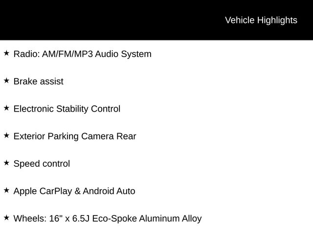 1.6L I4 DGI Hybrid DOHC 16V LEV3-SULEV30, Apple CarPlay & Android Auto, Brake assist, Electronic Stability Control, Exterior Parking Camera Rear, Radio: AM/FM/MP3 Audio System, Speed control, Wheels: 16" x 6.5J Eco-Spoke Aluminum Alloy.