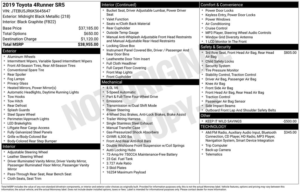 Don't miss your opportunity to own this exceptional 2019 Toyota 4Runner SR5. Schedule a test drive today and experience the power, versatility, and unparalleled value that this remarkable SUV has to offer.