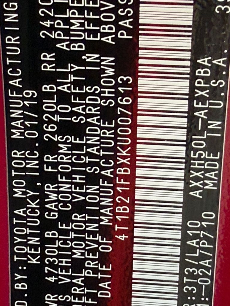 - VIN : 4T1B21FBXKU007613