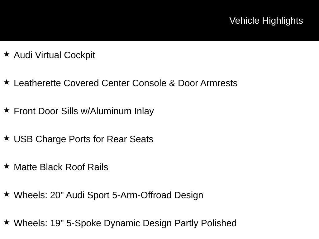 - Wheels: 20" Audi Sport 5-Arm-Offroad Design