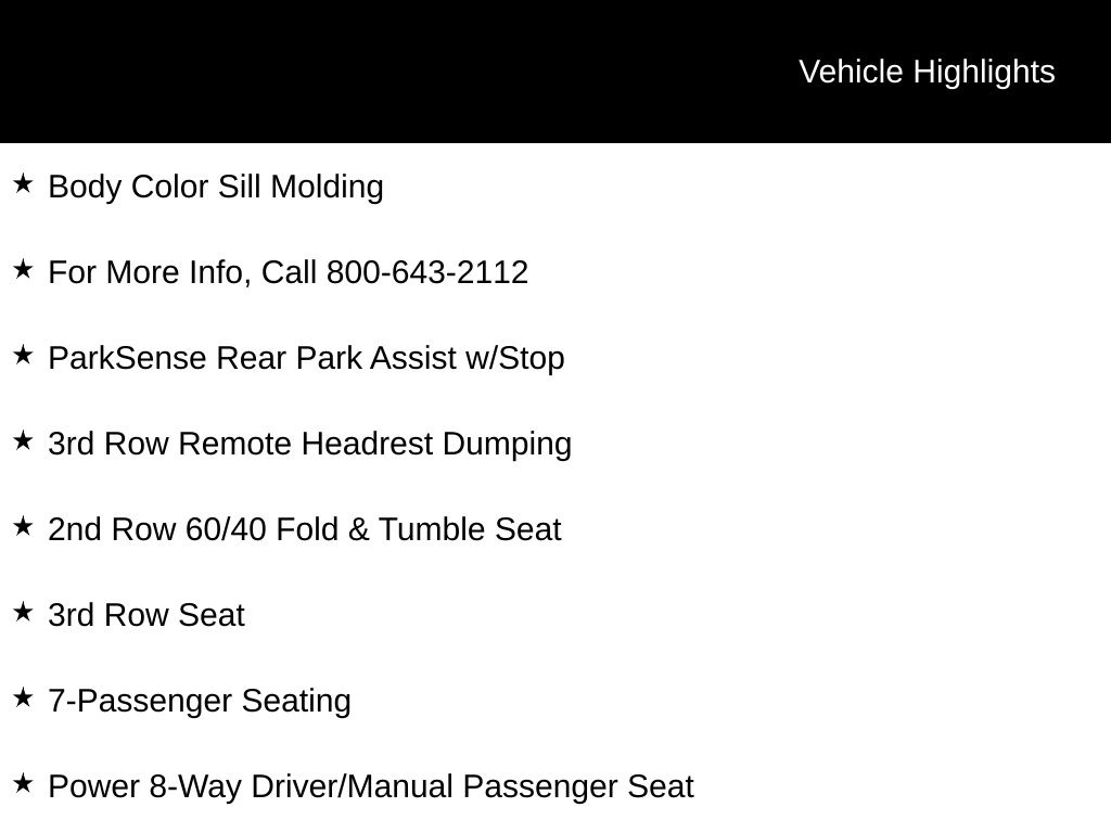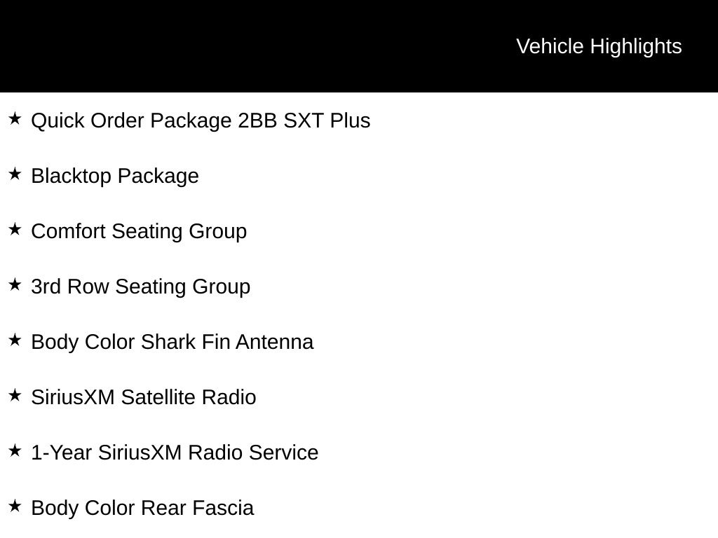 1-Year SiriusXM Radio Service, 2nd Row 60/40 Fold & Tumble Seat, 3rd Row Remote Headrest Dumping, 3rd Row Seat, 3rd Row Seating Group, 4-Way Power Driver Lumber Adjust, 7-Passenger Seating, Black Headlamp Bezels, Blacktop Package, Body Color Front Fascia, Body Color Rear Fascia, Body Color Shark Fin Antenna, Body Color Sill Molding, Body Color Wheel Lip Moldings, Bridgestone Brand Tires, Bright Side Roof Rails, Comfort Seating Group, Delete Roof Rack, Dual Rear Exhaust w/Bright Tips, For More Info, Call 800-643-2112, Gloss Black Badges, Gloss Black Exterior Mirrors, Gloss Black Grille, Integrated Roof Rail Crossbars, LED Daytime Running Headlamps, ParkSense Rear Park Assist w/Stop, Power 8-Way Driver/Manual Passenger Seat, Quick Order Package 2BB SXT Plus, SiriusXM Satellite Radio, Wheels: 20" x 8.0" High Gloss Black Aluminum.