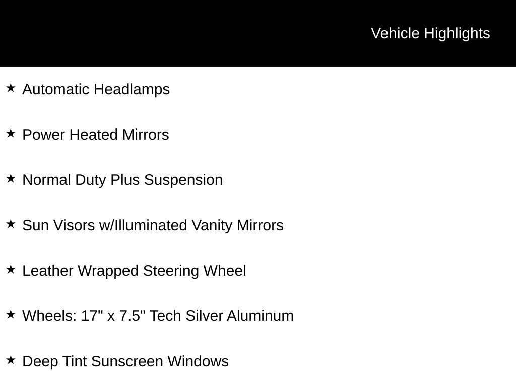- Wheels: 17" x 7.5" Black Steel Styled