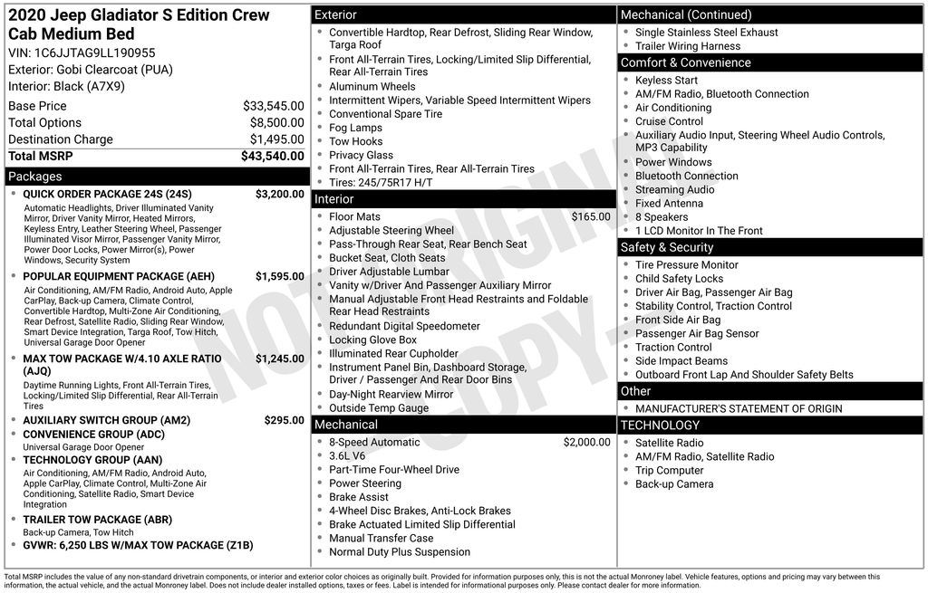 - VIN : 1C6JJTAG9LL190955