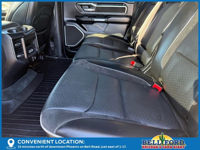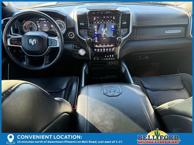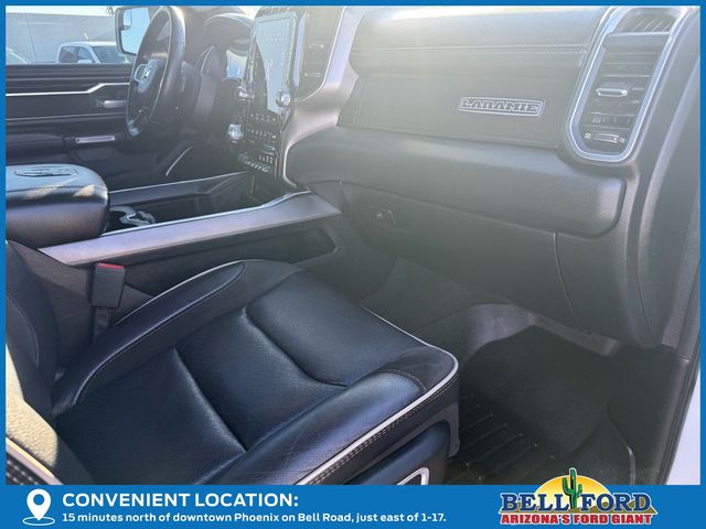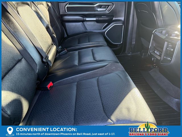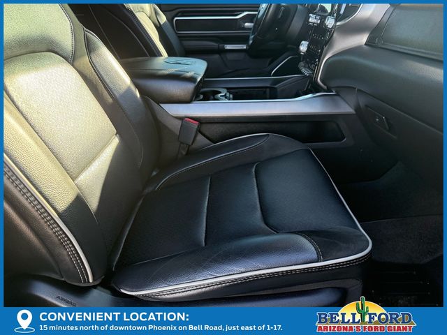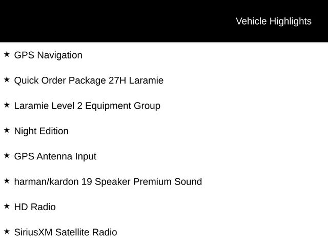 #1 Seat Foam Cushion, 1-Yr SiriusXM Guardian Trial, 3 Rear Seat Head Restraints, 4 Way Front Headrests, 4G LTE Wi-Fi Hot Spot, 5-Year SiriusXM Traffic Service, 5-Year SiriusXM Travel Link Service, 8.4" Touchscreen Display, Anti-Spin Differential Rear Axle, Apple CarPlay, Auto High Beam Headlamp Control, Black Exterior Truck Badging, Black Headlamp Bezels, Black Interior Accents, Black Tubular Side Steps, Blind Spot & Cross Path Detection, Body Color Door Handles, Body Color Exterior Mirrors, Body Color Front Bumper, Body Color Premium Power Mirrors, Body Color Rear Bumper w/Step Pads, Bucket Seats, Disassociated Touchscreen Display, Driver Seat Memory, Dual Exhaust w/Black Tips, Foam Bottle Insert (Door Trim Panel), For Details, Visit DriveUconnect.com, Front Seat Back Map Pockets, Full Length Upgraded Floor Console, GPS Antenna Input, GPS Navigation, Grille Surround 3 Black Texture 2 Black, harman/kardon 19 Speaker Premium Sound, HD Radio, Heated Front Seats, Heated Second Row Seats, Heated Steering Wheel, Integrated Center Stack Radio, Laramie Level 2 Equipment Group, Leather Trimmed Bucket Seats, Night Edition, No Satellite Coverage w/HI/AK/PR/VI/GU, ParkSense Front/Rear Park Assist w/Stop, Power 4-Way Driver Lumbar Adjust, Power 4-Way Passenger Lumbar Adjust, Power 8-Way Driver & Passenger Seats, Quick Order Package 27H Laramie, Radio: Uconnect 4C Nav w/8.4" Display, Rain Sensitive Windshield Wipers, Rear 60/40 Folding Seat, Rear 60/40 Folding Split Recline Seat, Rear Underseat Compartment Storage, Remote Tailgate Release, SiriusXM Satellite Radio, SiriusXM Traffic Plus, SiriusXM Travel Link, Sport Performance Hood, Tailgate Ajar Warning Lamp, Ventilated Front Seats, Wheels: 22" x 9" Forged Aluminum.