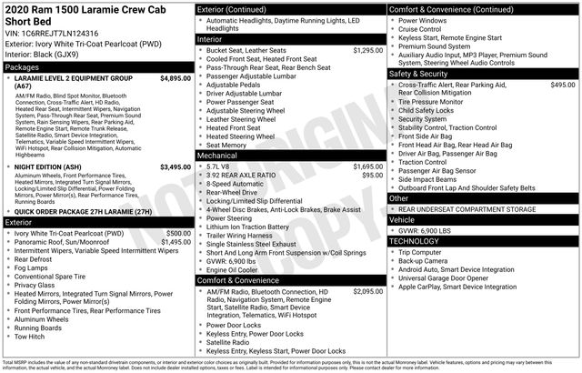 Ivory White Tri-Coat Pearlcoat 2020 Ram 1500 Laramie RWD 8-Speed Automatic HEMI 5.7L V8 Multi Displacement VVT