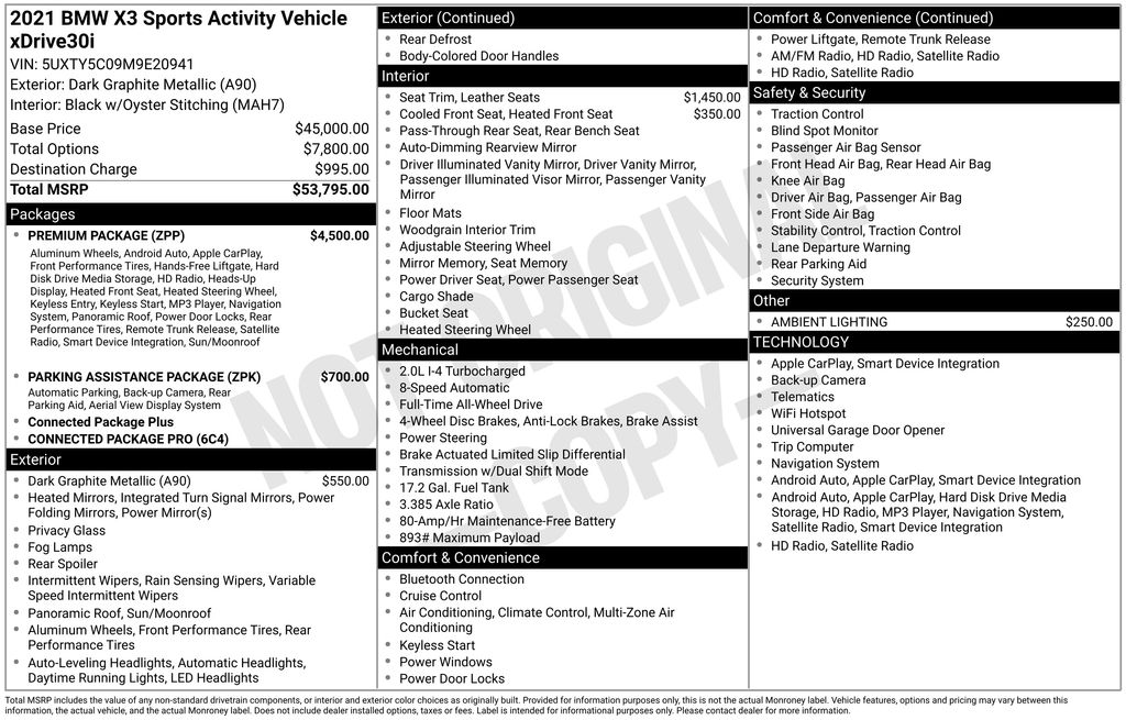 This 2021 BMW X3 xDrive30i is equipped with a premium package that includes 19-inch alloy wheels, a panoramic moonroof, heated front seats, and a head-up display. Additional features include: