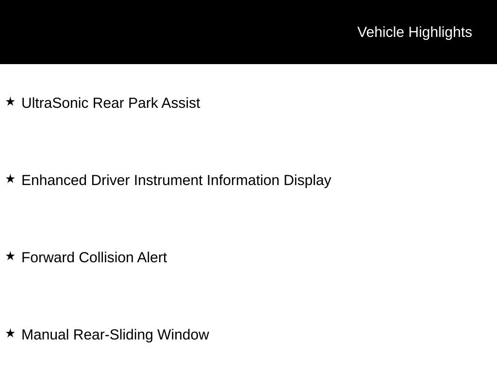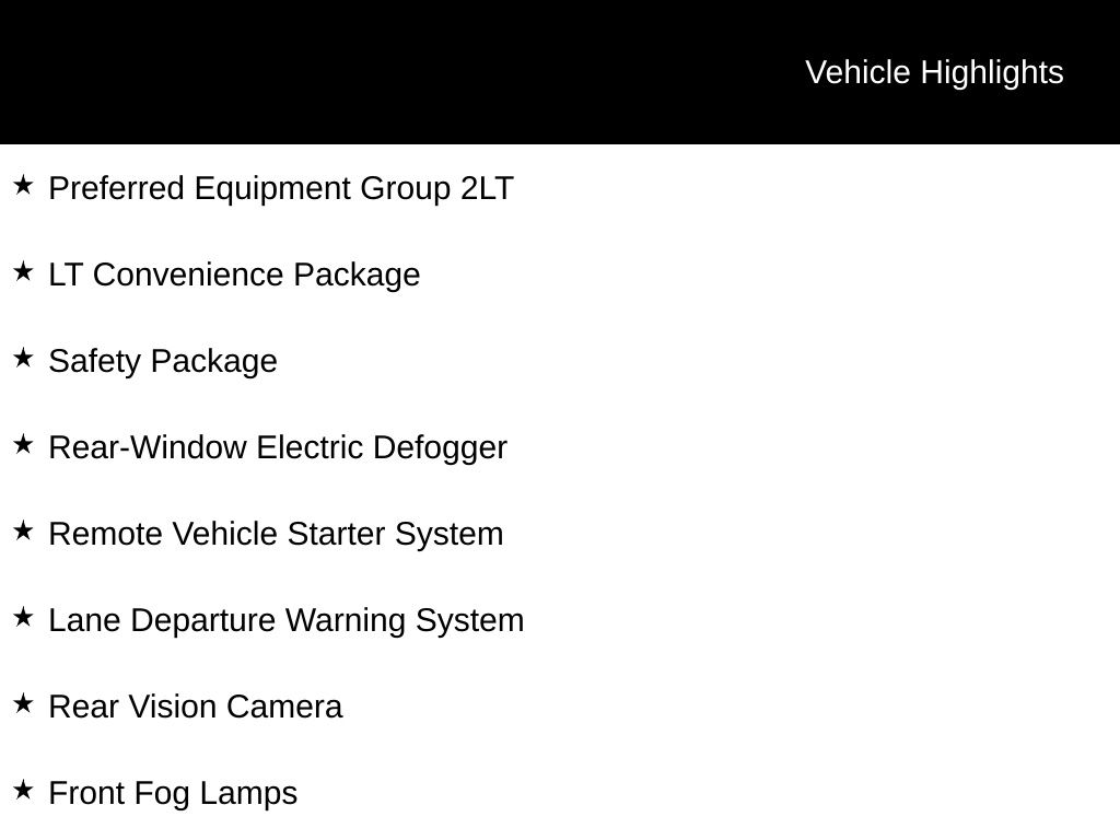 Enhanced Driver Instrument Information Display, Forward Collision Alert, Front Fog Lamps, Lane Departure Warning System, LT Convenience Package, Manual Rear-Sliding Window, Preferred Equipment Group 2LT, Rear Vision Camera, Rear-Window Electric Defogger, Remote Vehicle Starter System, Safety Package, UltraSonic Rear Park Assist.