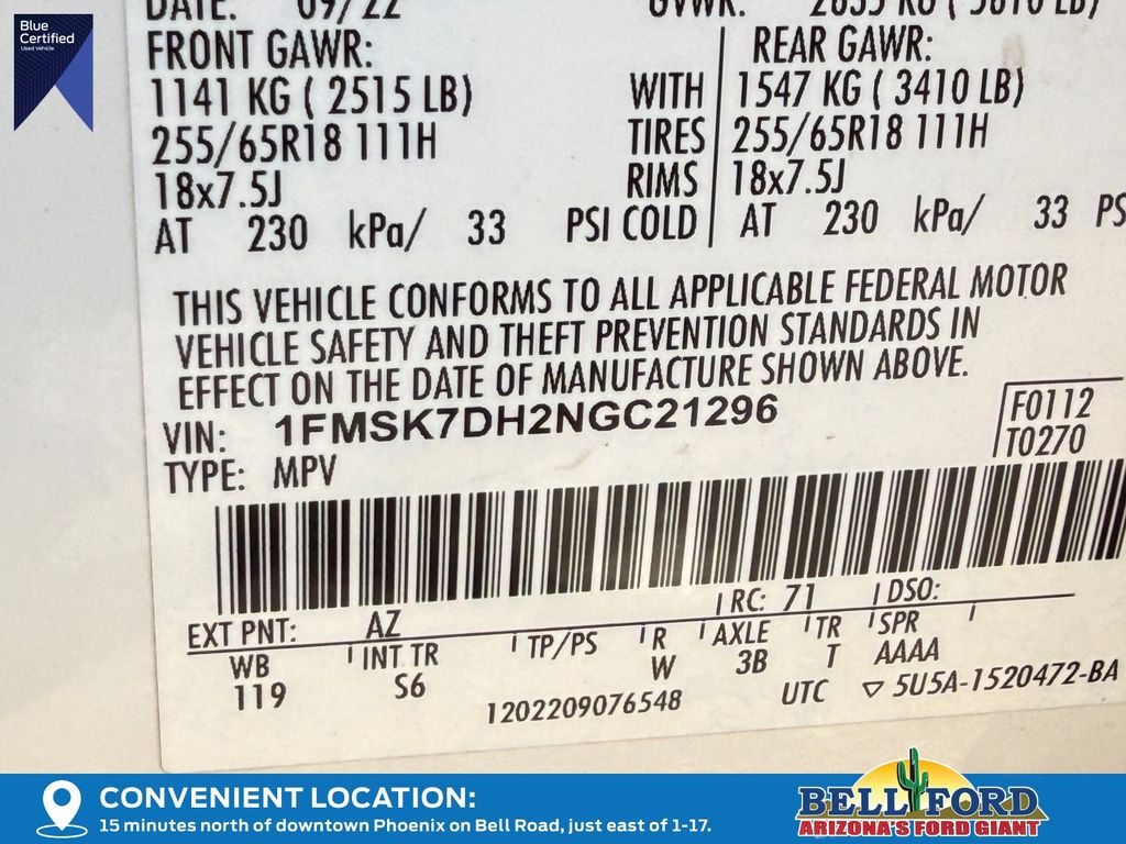 - VIN : 1FMSK7DH2NGC21296