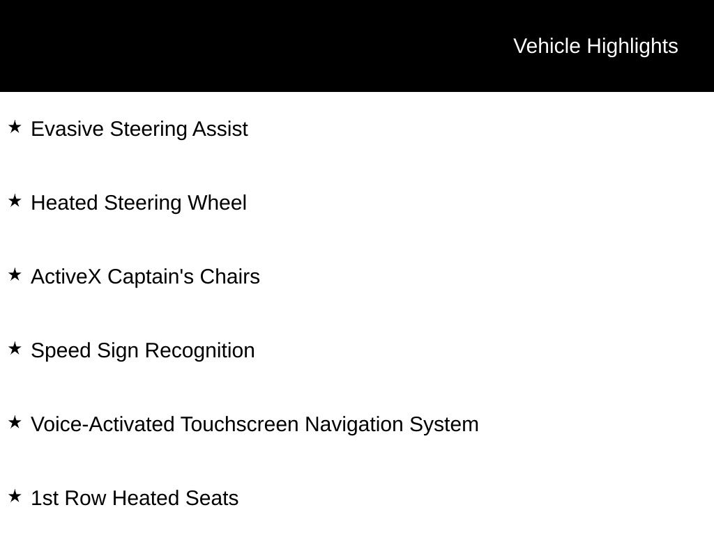 Standout features include Intelligent Adaptive Cruise Control, Evasive Steering Assist, LED Fog Lamps, a Heated Steering Wheel, and a Voice-Activated Touchscreen Navigation System. The ActiveX Captain's Chairs and Acoustic-Laminated Front Side Windows provide a premium, comfortable cabin experience.