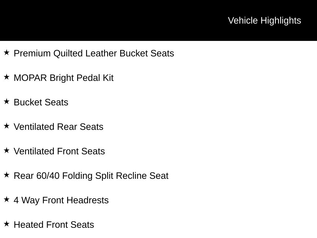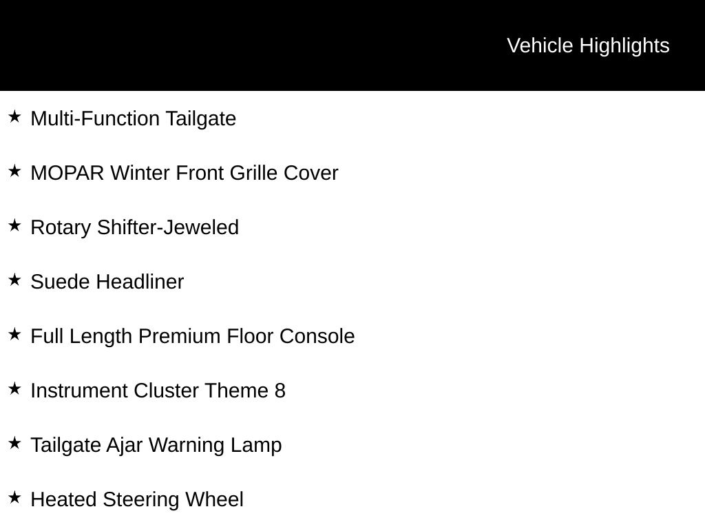 4 Way Front Headrests, Body Color Bumper Group, Bucket Seats, Cold Weather Group, Driver Seat Memory, Engine Block Heater, Front Seat Back Map Pockets, Full Length Premium Floor Console, Heated Front Seats, Heated Second Row Seats, Heated Steering Wheel, Instrument Cluster Theme 8, Limited 10th Anniversary Edition, MOPAR 4 Adjustable Cargo Tie-Down Hooks, MOPAR Bright Pedal Kit, MOPAR Deployable Bed Step Center Mount, MOPAR Winter Front Grille Cover, Multi-Function Tailgate, Power 4-Way Driver Lumbar Adjust, Power 4-Way Passenger Lumbar Adjust, Power 8-Way Driver & Passenger Seats, Premium Quilted Leather Bucket Seats, Quick Order Package 28M Limited, Rear 60/40 Folding Split Recline Seat, Rotary Shifter-Jeweled, Suede Headliner, Tailgate Ajar Warning Lamp, Ventilated Front Seats, Ventilated Rear Seats.