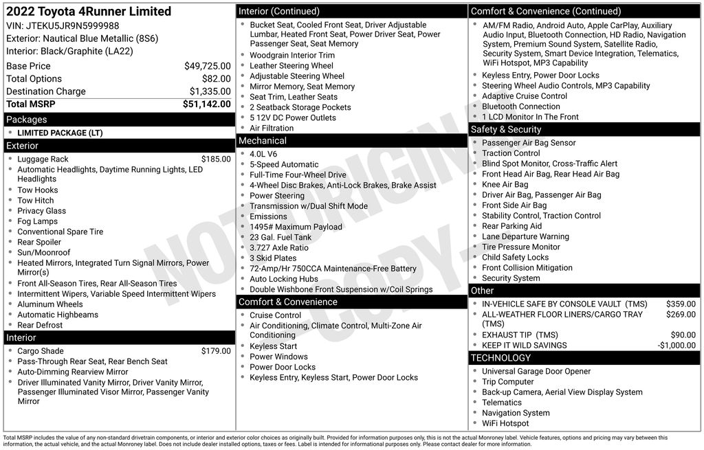 Beyond its dynamic performance, this 4Runner Limited is packed with premium amenities that cater to your every need. Indulge in the comfort of 15 premium JBL speakers, dual-zone automatic climate control, and a panoramic backup camera. Stay connected with seamless integration of Apple CarPlay and Android Auto. Safety is paramount, with features like Blind Spot Monitoring, Rear Cross-Traffic Alert, and a comprehensive suite of airbags.