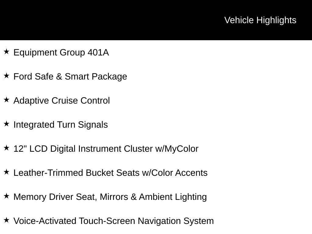 Enhancing the Mustang's already impressive performance credentials, this model is equipped with the Ford Safe & Smart Package, which includes advanced safety features like Adaptive Cruise Control and Integrated Turn Signals. The 12" LCD Digital Instrument Cluster with MyColor allows you to customize the display to your preferences, while the Heated Steering Wheel and Leather-Trimmed Bucket Seats with Color Accents add a touch of luxury and comfort to your daily commute.