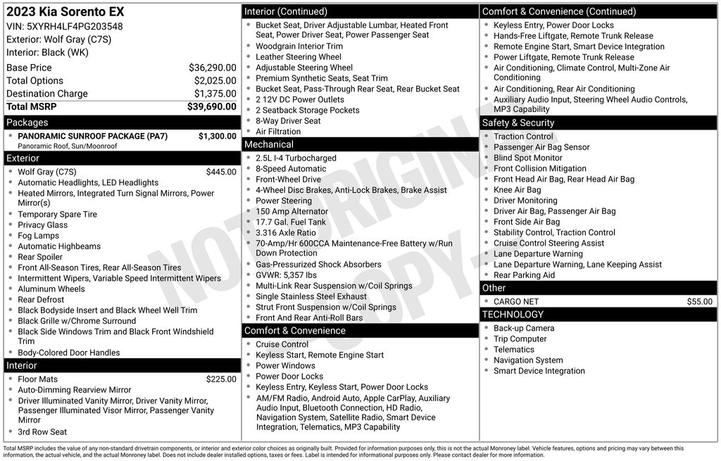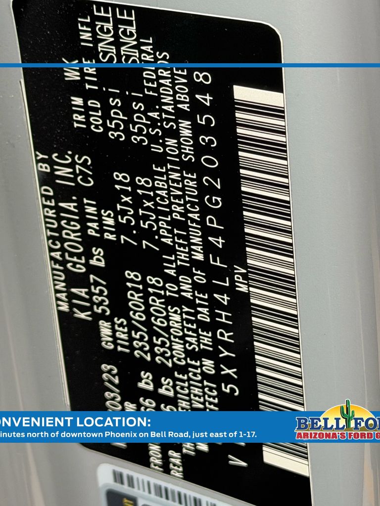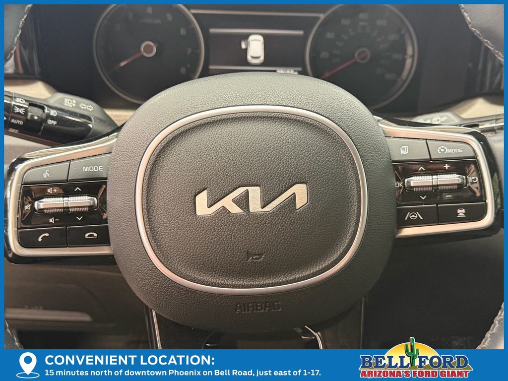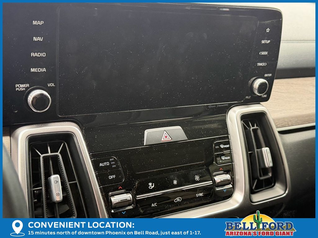 ** HERE AT BELL FORD ITS ALL ABOUT THE EXPERIENCE** Please visit us online at www.bellford.com This Kia Sorento is equipped with the following options: Panoramic Sunroof Package (LED Interior Lighting and Panoramic Power Sunroof w/Power Sunshade), 3.316 Axle Ratio, 3rd row seats: split-bench, 4-Wheel Disc Brakes, 6 Speakers, ABS brakes, Air Conditioning, Alloy wheels, AM/FM radio: SiriusXM, Apple CarPlay & Android Auto, Auto High-beam Headlights, Auto-dimming Rear-View mirror, Automatic temperature control, Brake assist, Bumpers: body-color, Cargo Net, Carpet Floor Mats, Delay-off headlights, Driver door bin, Driver vanity mirror, Dual front impact airbags, Dual front side impact airbags, Electronic Stability Control, Emergency communication system, Exterior Parking Camera Rear, Four wheel independent suspension, Front anti-roll bar, Front Bucket Seats, Front Center Armrest, Front dual zone A/C, Front fog lights, Front reading lights, Fully automatic headlights, Heated door mirrors, Heated Front Bucket Seats, Heated front seats, Illuminated entry, Knee airbag, Leather Shift Knob, Leather steering wheel, Low tire pressure warning, Navigation System, Occupant sensing airbag, Outside temperature display, Overhead airbag, Overhead console, Panic alarm, Passenger door bin, Passenger vanity mirror, Power door mirrors, Power driver seat, Power Liftgate, Power passenger seat, Power steering, Power windows, Radio data system, Radio: AM/FM Audio System, Rear air conditioning, Rear anti-roll bar, Rear reading lights, Rear window defroster, Rear window wiper, Remote keyless entry, Roof rack: rails only, Security system, Smart Key w/ Push Button and Remote Start, Speed control, Speed-sensing steering, Split folding rear seat, Spoiler, Steering wheel mounted audio controls, SynTex Artificial Leather Seat Trim, Tachometer, Telescoping steering wheel, Tilt steering wheel, Traction control, Trip computer, Turn signal indicator mirrors, Variably intermittent wipers, and Wheels: 7.5J x 18" Machine-Finished AlloY.
