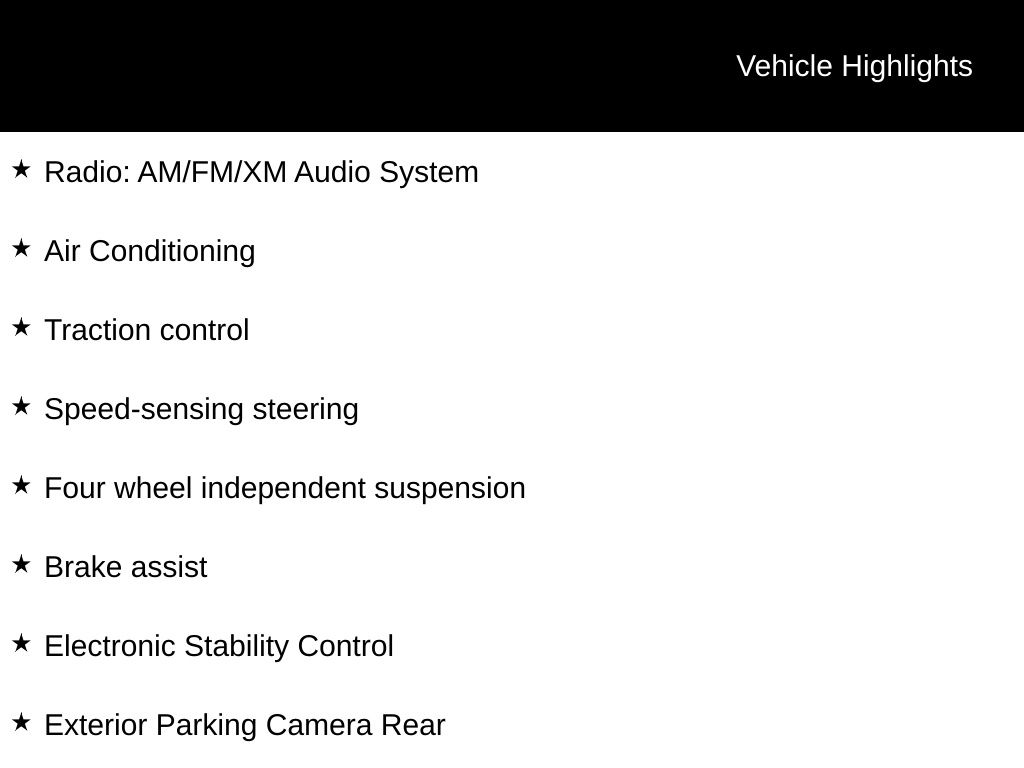 AWD, Black Artificial Leather, 19" Split 5-Spoke Alloy Wheels, Air Conditioning, Brake assist, Electronic Stability Control, Exterior Parking Camera Rear, Four wheel independent suspension, Radio: AM/FM/XM Audio System, Speed control, Speed-sensing steering, Traction control.