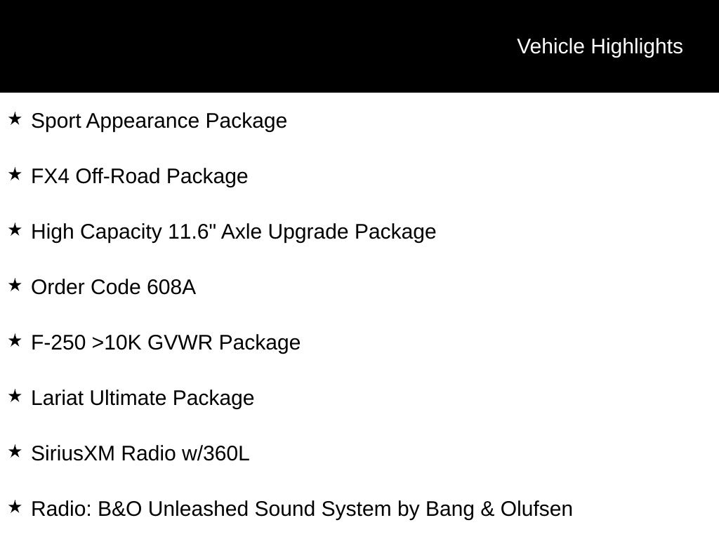 But this truck isn't just about good looks and creature comforts it's built to work hard. The FX4 Off-Road Package and High Capacity 11.6" Axle Upgrade equip this F-250 with the capability to tackle any terrain, while the Lariat Ultimate Package adds a host of advanced safety and convenience features, including Pro Trailer Backup Assist, Intelligent Adaptive Cruise Control, and a Head-Up Display.