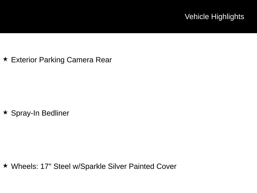 2.5L I-4 Hybrid, Air Conditioning, Automatic temperature control, Brake assist, Electronic Stability Control, Equipment Group 100A Standard, Exterior Parking Camera Rear, Radio: AM/FM Stereo w/6 Speakers, Speed-sensing steering, Spray-In Bedliner, Traction control, Wheels: 17" Steel w/Sparkle Silver Painted Cover.