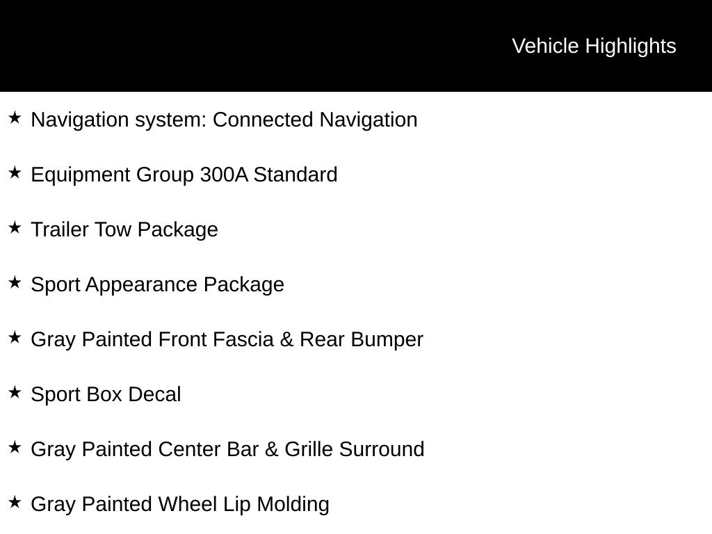 4WD, Class IV Trailer Hitch Receiver, Equipment Group 300A Standard, Gray Painted Center Bar & Grille Surround, Gray Painted Front Fascia & Rear Bumper, Gray Painted Wheel Lip Molding, Navigation system: Connected Navigation, Sport Appearance Package, Sport Box Decal, Trailer Tow Package.