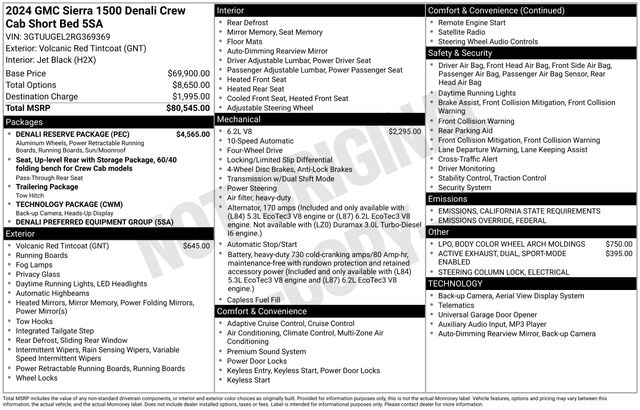 10-Speed Automatic, 4WD, Jet Black Leather, 120-Volt Bed Mounted Power Outlet, 120-Volt Interior Power Outlet, 170 Amp Alternator, 2 Charge/Data USB Ports Inside Center Console, 2 Type-C Charge-Only Rear USB Ports, 2 USB Ports, Auto-Locking Rear Differential, Auxiliary External Transmission Oil Cooler, Bed View Camera, Chrome Header w/Signature Denali Chrome Grille, Chrome Recovery Hooks, Chrome Wheel To Wheel Assist Steps, Color-Keyed Carpeting Floor Covering, Deep-Tinted Glass, Denali Reserve Package, Electric Rear-Window Defogger, Floor-Mounted Center Console, Front Rain-Sensing Wipers, GMC Connected Access Capable, GMC MultiPro Power Steps, HD Surround Vision, Heated 2nd Row Outboard Seats, Heated Driver & Front Outboard Passenger Seating, Heavy-Duty Air Filter, Hill Descent Control, Hitch Guidance, Hitch View, In-Vehicle Trailering System App, Integrated Trailer Brake Controller, Keyless Open & Start, LED Cargo Area Lighting, Multicolor 15" Diagonal Head-Up Display, OnStar & GMC Connected Services Capable, Perimeter Lighting, Power Door Locks, Power Front Passenger Windows w/Express Up/Down, Power Front Windows w/Driver Express Up/Down, Power Rake & Telescoping Steering Column, Power Rear Windows w/Express Down, Power Sliding Rear Window w/Rear Defogger, Power Sunroof, Preferred Equipment Group 5SA, Premium Bose 7-Speaker Sound System, Push Button Start, Rear Camera Mirror, Rear Cross Traffic Braking, Rear Pedestrian Detection, Rear Wheelhouse Liners, Remote Vehicle Starter System, SiriusXM w/360L, Spray-On Pickup Bedliner w/Denali Logo, Steering Wheel Audio Controls, Technology Package, Theft Deterrent System (Unauthorized Entry), Trailer Camera Provisions, Trailer Side Blind Zone Alert, Trailering Package, Ultrasonic Front & Rear Park Assist, Universal Home Remote, Ventilated Driver & Front Passenger Seats, Wheel Locks (Set of 4) (LPO), Wheels: 22" x 9" Painted Aluminum, Wi-Fi Hotspot Capable, Wireless Charging.
