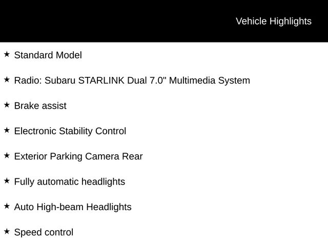 Auto High-beam Headlights, Brake assist, Cloth Upholstery, Electronic Stability Control, Exterior Parking Camera Rear, Fully automatic headlights, Radio: Subaru STARLINK Dual 7.0" Multimedia System, Speed control, Standard Model, Wheels: 16" x 6.0" Full Cap 1/2 J Steel.