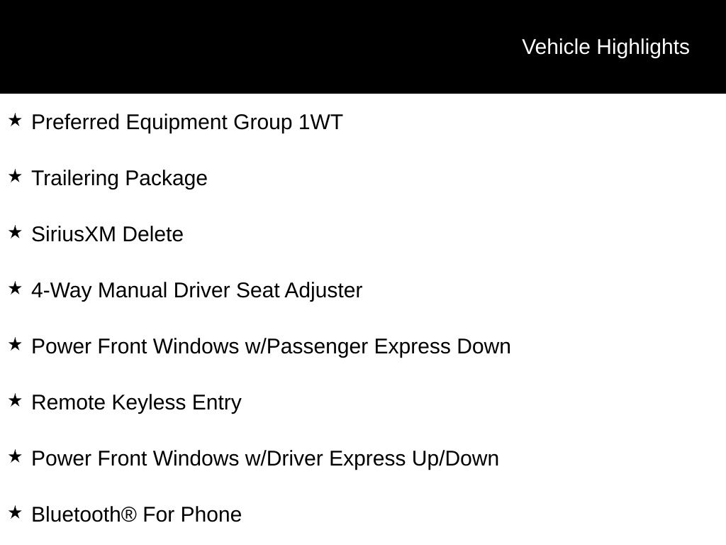The Silverado's impressive list of features includes SiriusXM Delete, Bluetooth for phone, power front windows, remote keyless entry, and a high-definition rear vision camera. The Preferred Equipment Group 1WT adds even more value, with a premium audio system, air conditioning, and a suite of advanced safety technologies like Forward Collision Alert and Lane Keep Assist.
