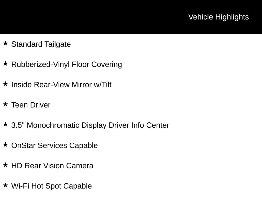 The interior of the Silverado 1500 WT is designed with your comfort and convenience in mind. The 40/20/40 front split bench seat, vinyl seat trim, and front center armrest with storage provide a comfortable and practical driving experience. The 3.5" monochromatic display driver information center keeps you informed, while the OnStar services and Wi-Fi hotspot capability keep you connected on the go.